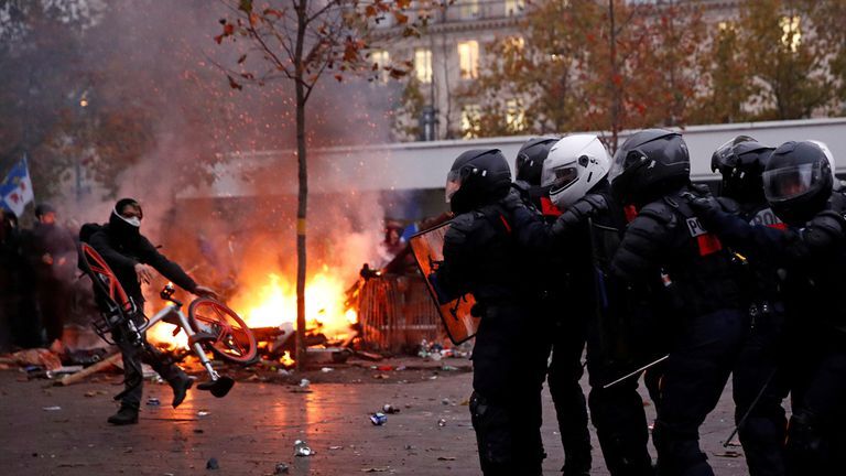 17일(현지 시각) 프랑스 파리 콩코르드 광장에서 정부의 연금 개혁안 강행에 반대하는 시위대가 공중에 매단 에마뉘엘 마크롱 대통령의 전신 사진을 불태우고 있다. 전날 마크롱 대통령이 은퇴 연령(정년)을 2년 연장하는 연금 개혁안을 하원 표결 없이 정부가 단독으로 입법하는 초강수를 두자 시민 수만명이 곳곳에서 대규모 시위를 이어가며 격렬히 반발했다. /로이터 뉴스1