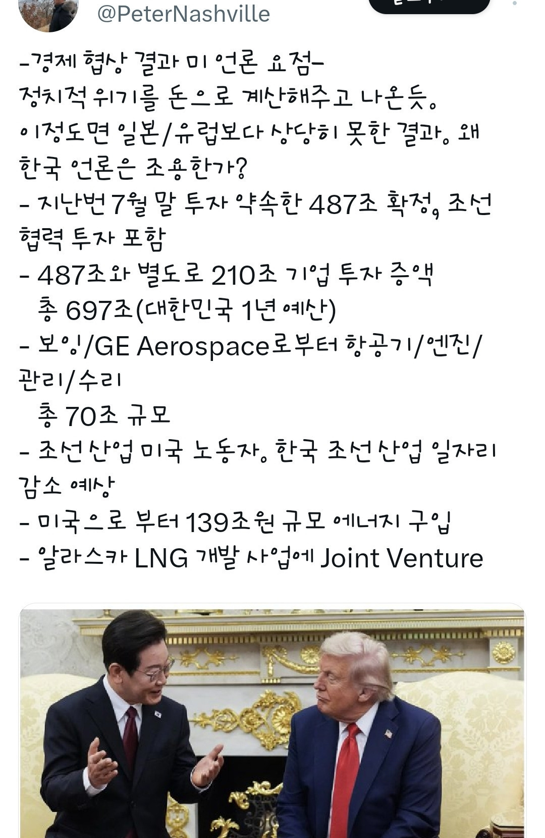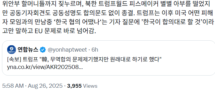 - 이재명의 약점을 파악한 트럼프는 앞으로 이 카드를 가지고 더 많은 것을 요구할 수 있다