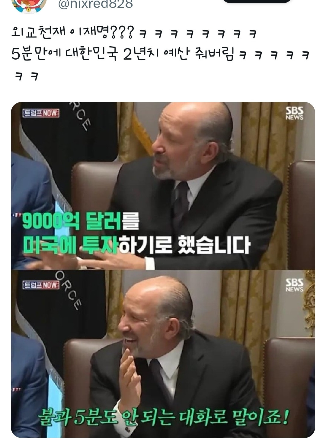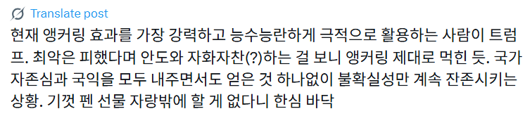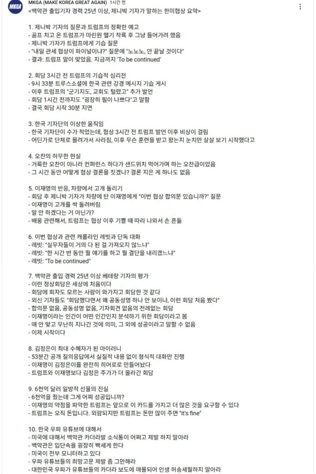 - 9시 33분 트루스소셜에 한국 관련 강경 메시지 기습 게시