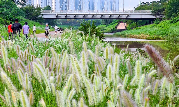 지난 5일 여전히 낮 최고기온이 30도를 웃도는 날씨를 보이고 있지만 아침저녁으로 선선한 바람도 불어온다. 광주 광산구 풍영정천에는 수크령이 핀 천변을 따라 시민들이 산책을 하고 있다. /김영근 기자