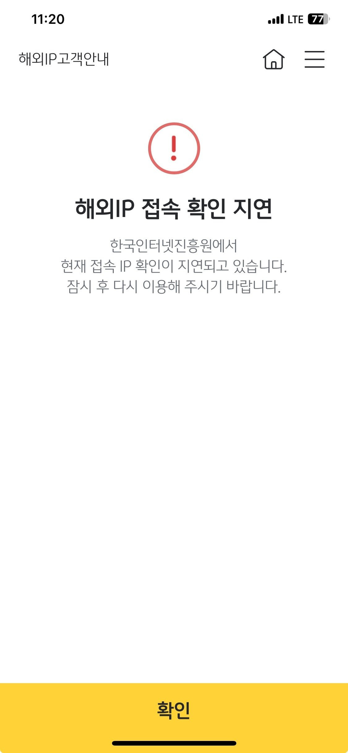 27일 뉴스1 취재에 따르면 현재 국민은행의 ‘해외 IP 차단 서비스’를 신청한 고객은 이체성 거래가 중단된 상태다. 해당 고객은 ‘해외IP 접속 확인 지연’, ‘한국인터넷진흥원에서 현재 접속 IP 확인이 지연되고 있습니다. 잠시 후 다시 이용해 주시기를 바랍니다’라는 문구가 뜨고 있다.