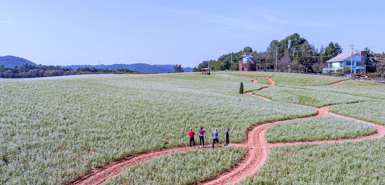 구름처럼 피어난 메밀꽃은 가을의 서정을 대표한다. 1일 전북 고창군 공음면 학원농장을 찾은 관광객들이 메밀밭길을 걷고 있다./김영근 기자