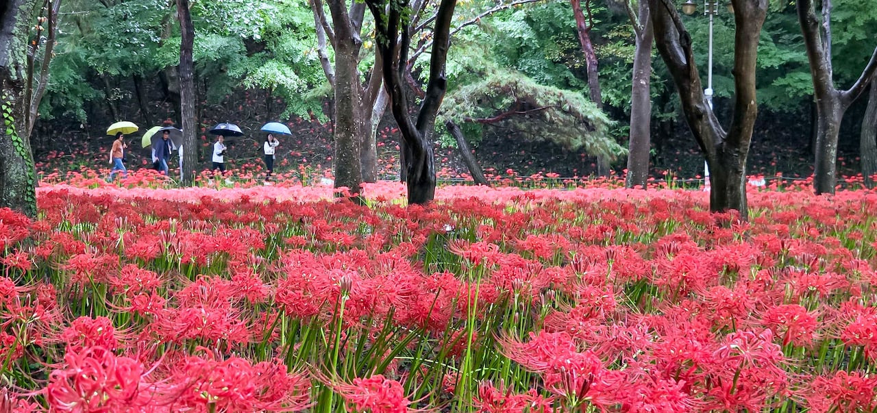불갑사의 꽃무릇은 그 붉음으로 계절의 전환을 알린다. 가을비가 내린 지난달 25일 전남 영광군 불갑면 불갑사로 가는길에는 붉은 꽃무릇이 활짝 피었다./ 김영근 기자