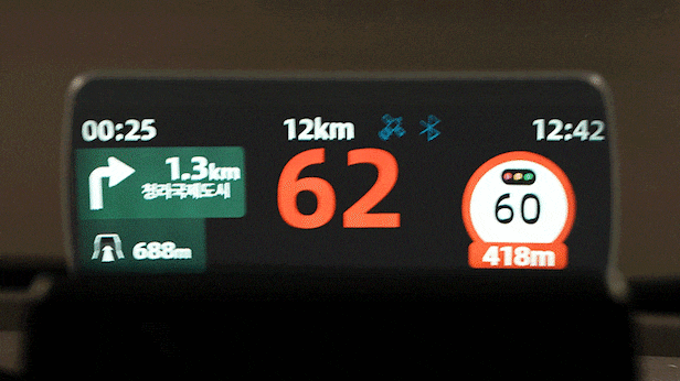 그렇게 타협한 크기가 딱 손바닥이었다. 중앙 상단에는 현재 시각을 표시했고 왼쪽에는 현재 속도, 오른쪽엔 길 안내를 위한 화살표가 뜨도록 했다. “좌회전·우회전은 물론이고 10시 방향, 1시 방향까지 보여줍니다. 지하차도 옆길이나 분홍색·초록색 유도선, 과속방지턱 등이 등장할 땐 중앙에 아이콘으로 표시되죠. 신호·과속·구간·이동식 카메라가 있을 땐 빨간 표시등과 함께 소리로 안내해 줍니다. 이 모든 아이콘은 티맵 앱에서 뜨는 아이콘과 동일한 모양입니다. 평소 티맵을 사용하던 이용자라면 더욱 빠르게 적응할 수 있습니다.”
