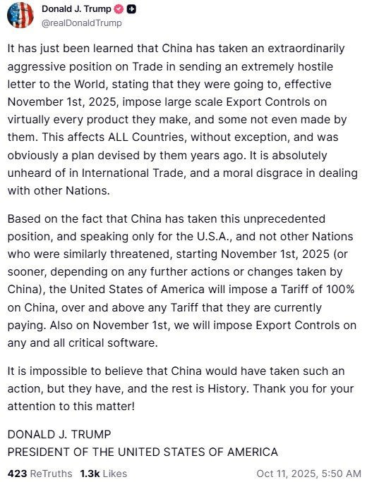 그는 “중국이 무역 문제에 대해 극도로 공격적인 입장을 취하며 전 세계에 극히 적대적인 서한을 보냈다는 사실이 방금 확인됐다”면서 “해당 서한에는 2025년 11월 1일부터 자국이 생산하는 거의 모든 제품과 심지어 자국에서 생산하지도 않는 일부 제품에 대해 대규모 수출 통제를 시행할 것이라고 명시되어 있었다”라고 주장했다.