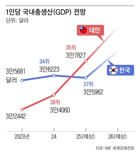 이같이 어두운 전망은 대만과 정반대다. IMF는 대만의 1인당 GDP가 작년 3만4060달러에서 올해 3만7827달러로 11.1% 증가하면서, 세계 순위도 38위에서 35위로 단숨에 세 계단 뛸 것으로 예상했다.