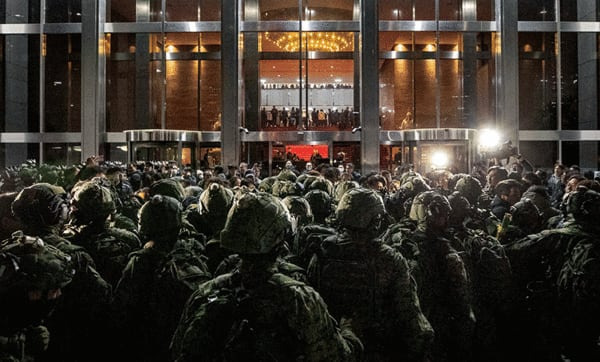 계엄군이 지난해 12월 4일 새벽 국회 본관 정문 앞에서 국회 사무처 직원, 보좌진 등과 대치하고 있다. photo 김지호 조선일보 기자
