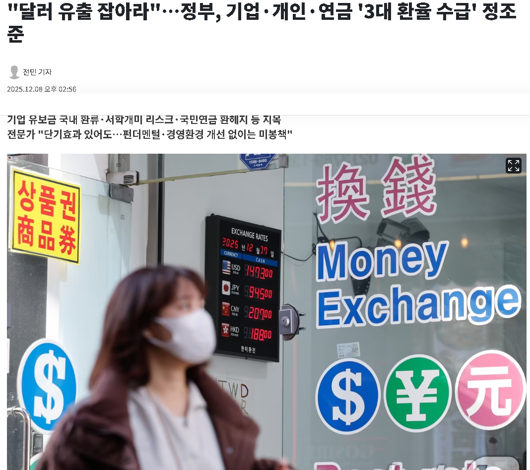 그러면서 정부가 현재 진행 중인 대책으로 △기업의 해외 부문 이익 국내 환류 △개인의 해외 투자 리스크 점검 △국민연금의 환헤지 및 투자 비중 조절 등 세 가지를 꼽았다. 이는 달러가 해외로 빠져나가는 흐름을 제어하고, 묶여 있는 달러를 국내로 유도하는 데 정책 역량을 집중하겠다는 뜻이다.