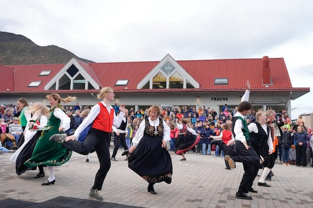 작년 8월 14일, 노르웨이의 스발바르에 대한 주권 행사 100주년을 기념하기 위해 롱이어비엔 마을 광장에서 열린 축제에서 민속 무용단 폴라레이크가 춤을 추고 있다./Norsk Telegrambyrå