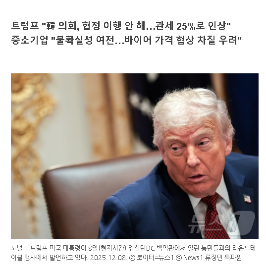 관세 협상 타결 당시 국내 중소·벤처기업계는 무역 불확실성 해소와 대미 수출 확대 기반을 마련했다고 반겼으나, 이날 트럼프 대통령의 관세 25% 재부과 발언으로 불확실성이 재현되는 것 아니냐는 현장의 우려가 나온다.