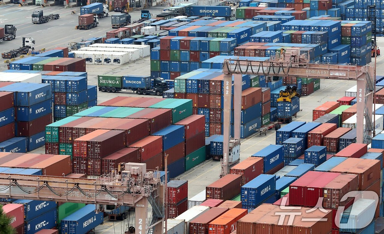 부산항 신선대부두 야적장에 컨테이너가 가득 쌓여 있는 모습. 2025.8.11/뉴스1 ⓒ News1 윤일지 기자