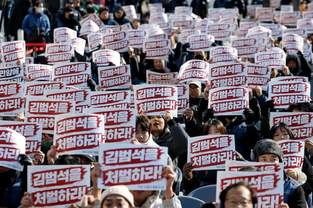 지난 1일 오후 서울 송파구 송파대로 쿠팡 본사 앞에서 열린 쿠팡 피해자 행동의 날 집회에서 참석자들이 '김범석을 처벌하라'는 손피켓을 들어 구호를 외치고 있다./뉴스1