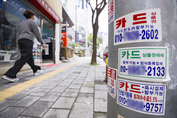 지난해 10월 서울 시내의 한 음식점 거리에 놓인 가로등에 카드 대출 안내문이 붙어 있다. 뉴시스