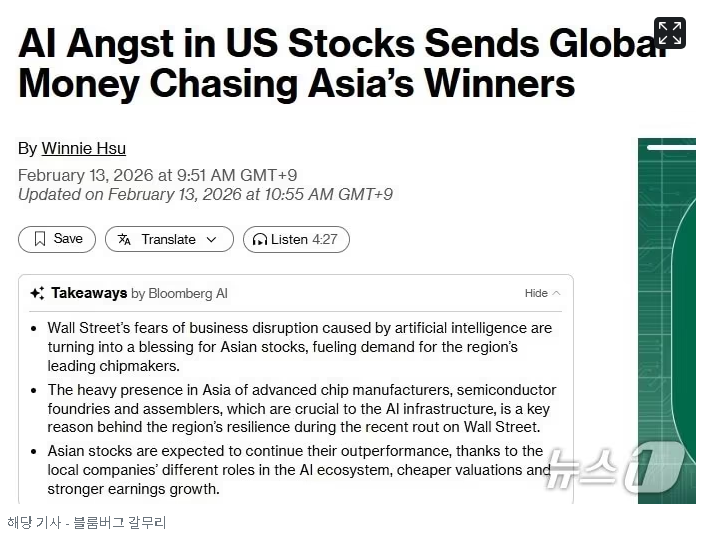 이는 글로벌 투자자들이 미국 기술주를 정리하고 한국의 삼성전자나 대만의 TSMC에 투자하고 있기 때문이라고 블룸버그통신이 13일 보도했다.