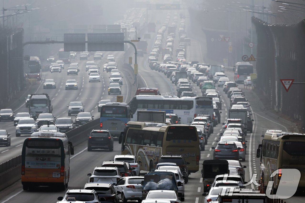 설 연휴가 시작된 지난 14일 서울 서초구 잠원IC 인근 경부고속도로 하행선이 정체를 빚고 있다. 2026.2.14 ⓒ 뉴스1 박정호 기자