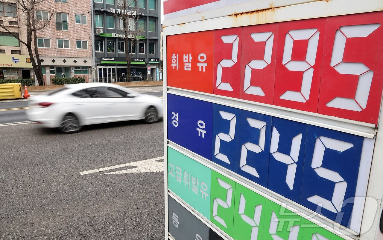 6일 서울의 한 주유소에 유류 가격이 표시돼 있다. 중동 리스크와 수급 불안정성에 따라 서울 평균 휘발유 가격이 리터당 1900원을 넘는 등 국내 기름값이 엿새 연속 오름세를 보이고 있다. 한편, 정부 합동반은 이날부터 주유소를 직접 방문해 가격 동향과 판매 상황을 점검하는 현장 점검에 나설 예정이다. 2026.3.6 ⓒ 뉴스1 김진환 기자