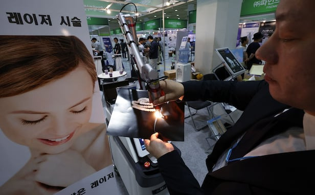 빅5 병원(서울대·서울아산·세브란스·삼성서울·서울성모)에서 필수의료로 전문의를 딴 의사들까지 서울 청담동과 목동 번화가 피부 미용 의원 개업에 몰리고 있다. 사진은 코엑스에서 열린 ‘한의학 및 통합의약 국제산업박람회’ 더원메디칼 부스에서 색소지우개 토닝레이저 제품을 시연하는 모습. /뉴스1