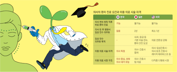 선진국에서는 미용 의료든 필수 의료든 이렇게 의사 면허를 취득하자마자 아무 임상 경험 없이 환자를 진료하는 것을 허용하지 않는다. 일정 기간의 임상 연수 또는 수련 과정을 반드시 거쳐야만 환자를 볼 수 있다. 기본적인 진료 술기를 배우고 응급 상황 대응 능력을 익힌 뒤에야 독립적으로 환자 진료가 가능하다.